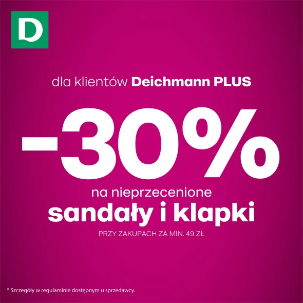 Teraz w DEICHMANN nieprzecenione sandały i klapki przy zakupie za min. 49zł dla klientów Deichmann PLUS z rabatem 30%! Tak, tak! 30% na nieprzecenione sandały i klapki przy zakupach za min. 49zł! I takie RABATY to my rozumiemy!